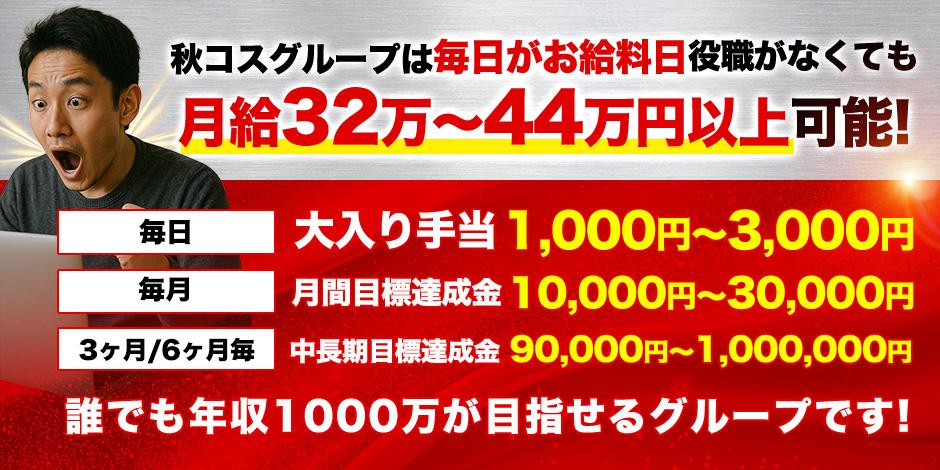 【秋コスグループは毎日がお給料日】私達【秋コスグループ】では働いていただく皆さまの頑張りに応えるため、日ごと、月ごと、中長期ごとに達成金をご用意!まさに【毎日がお給料日】です!秋コスグループで働くすべ…